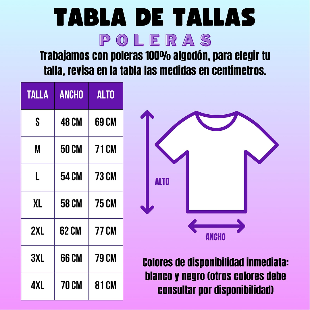 - Confeccionado en poleras 100% algodón, talla estándar unisex y cuello redondo.