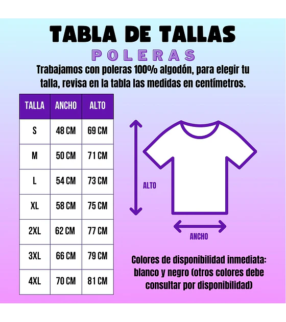 - Confeccionado en poleras 100% algodón, talla estándar unisex y cuello redondo.